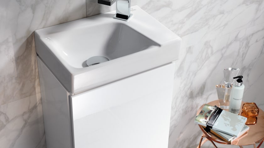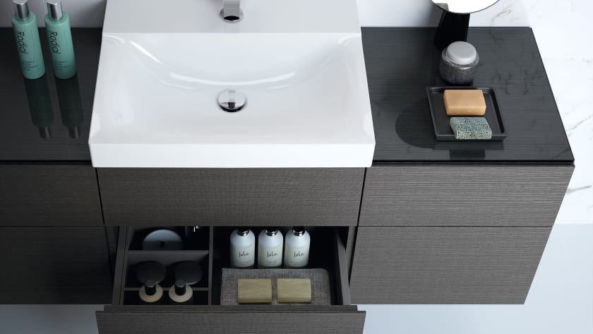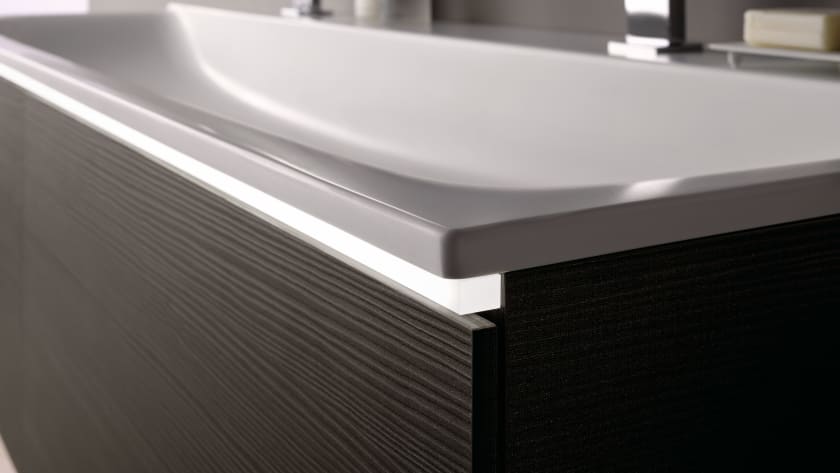 Die Designserie Geberit Xeno² steht für architektonischen Design-Minimalismus mit klaren geometrischen Linien außen und weichen, natürlichen Formen innen. Grifffreie Waschtischunterschränke mit Push-to-open-Mechanismus betonen das reduzierte Design.