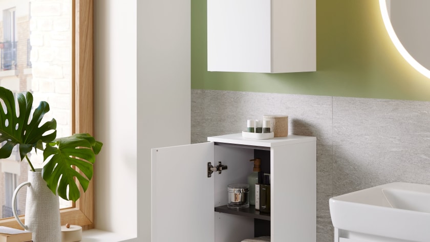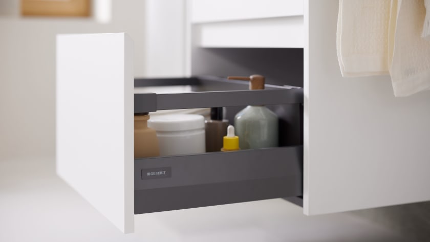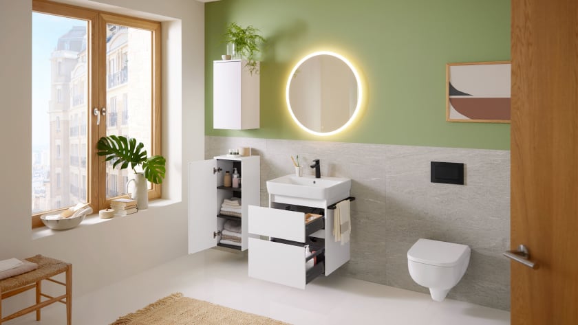Geberit Renova Plan bietet zeitlose Waschtischkeramiken und moderne Möbel für Privat- und Projektbäder. Clevere Stauraumlösungen mit individuell kombinierbaren Schränken sorgen für Ordnung. SlimRim-Waschtische und großzügige Unterschränke setzen Akzente. Ergänzt durch ein WC mit leiser, gründlicher TurboFlush-Spültechnik.